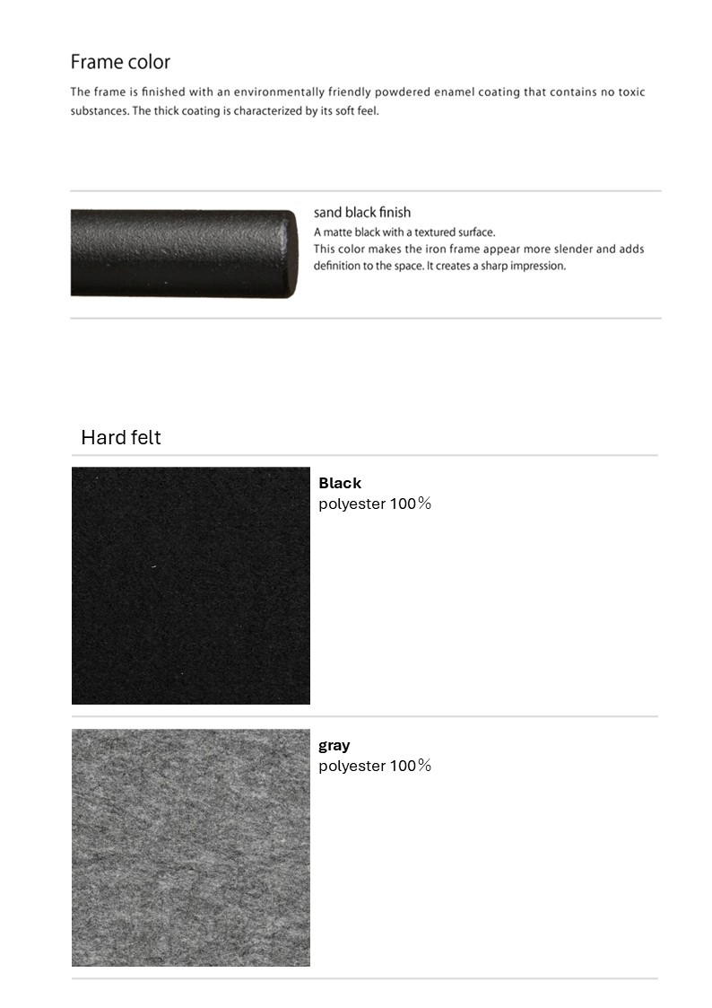 seated use and 1550mm for standing use. The hard felt is available in two colors black and gray